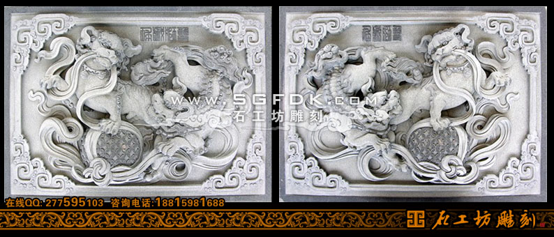 雙獅戲球堵圖案雕刻