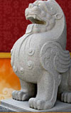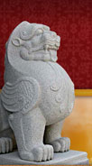 石獅子淪為看家護(hù)院的保安,其造型更趨生活化,清代《揚(yáng)州畫舫錄》中規(guī)定獅子的營造格式為:“獅子分頭、臉、身、腿、牙、胯、繡帶、鈴鐺、旋螺紋、滾鑿繡珠、出鑿崽子!扁忚K、繡帶、繡珠等,完全是家犬的標(biāo)配。