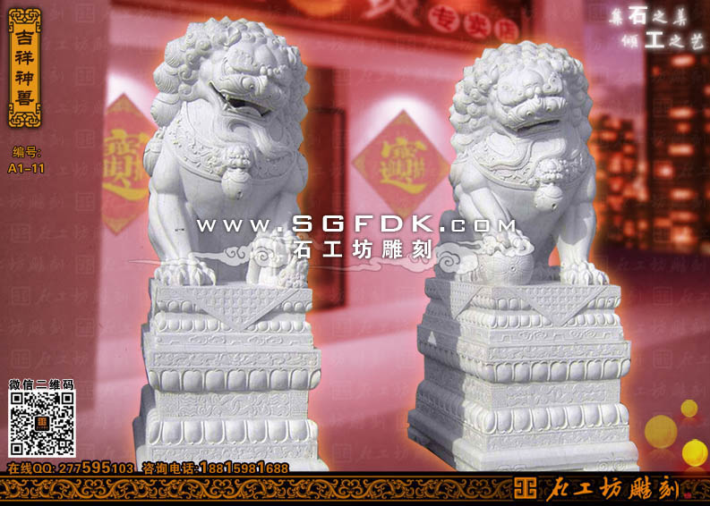 漢白玉是一種比較高貴的石材,其材質(zhì)雪白均勻,是雕刻的好石材,用漢白玉雕的獅子,高貴又而大氣,盡顯獅子的威嚴和霸氣。石獅其實是另一種形式的門枕石,乃鞏固門框的構(gòu)件。因?qū)賵A雕作品,以完整的體態(tài)呈現(xiàn),故最能展現(xiàn)石匠的功力,此石獅雕工相當精巧,尤其背部的波浪形鬃毛,線條流暢而柔美。獨特性 中國的石獅造形各地差異性大,臺灣與福建同屬為南方系統(tǒng),強調(diào)姿勢,重視表情,體形較小,與北方雄偉剛健、體態(tài)高大的北京獅的造形迥然不同。北京獅其實就是北京故宮的獅子,它是皇權的象征,霸氣十足。