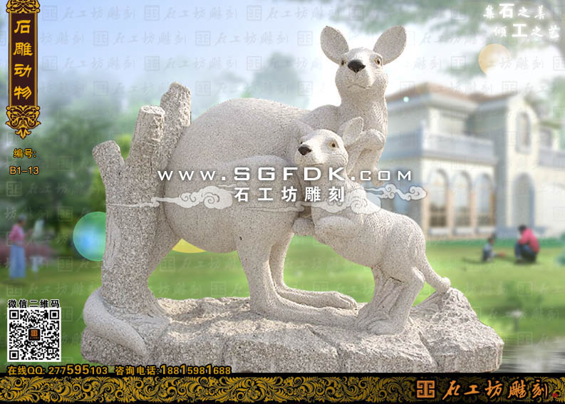 石雕袋鼠雕塑一般都常放置于公園、園林景觀等地方,不但可以起到裝飾和美化我們生活空間的作用,更加可以起到教育警示的作用。時(shí)刻提醒著我們珍愛地球、保護(hù)環(huán)境、保護(hù)動(dòng)物的環(huán)保意識。