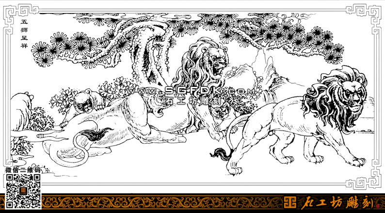 石雕圖紙?jiān)O(shè)計(jì)五獅呈祥白描圖