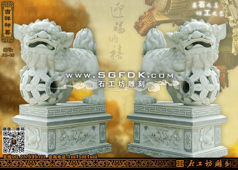 獻(xiàn)錢獅:是因石獅造型前一般常飾一串古錢而得名,它是南方石獅當(dāng)中的一種造型。獻(xiàn)錢獅寓有招財進(jìn)寶之意,造型可愛乖巧,富有靈性。它是漢族民間最為常見的一種石獅造型之一,常擺放于寺廟或是祠堂門前。獻(xiàn)錢獅一般也為雌雄一對,雄獅常飾于大串的銅錢,寓意招財進(jìn)寶。而雌獅則戲玩著小獅子,寓意人丁興旺之意。