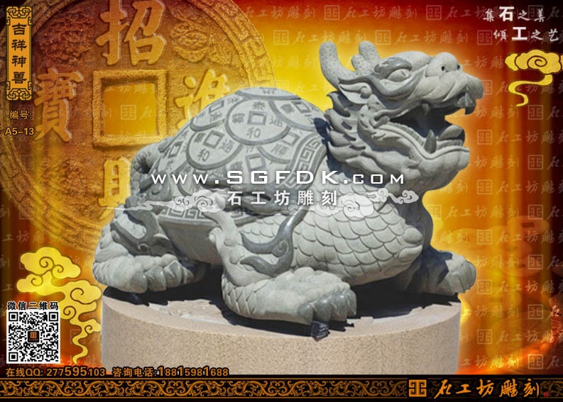 「龍龜」也稱為龍頭龜,因其龜身龍頭而得名,它外型為龍頭龜身,相傳為它是「龍生九子」之一子,具龍與龜兩種靈獸的特質(zhì)!庚垺挂话阍陲L水應(yīng)用有:招貴人、制白虎(小人)及生旺財運的功用。另外「龜」具有長壽、祥和和化煞的作用。因而在風水上是最被喜愛擺設(shè)的靈獸之一。